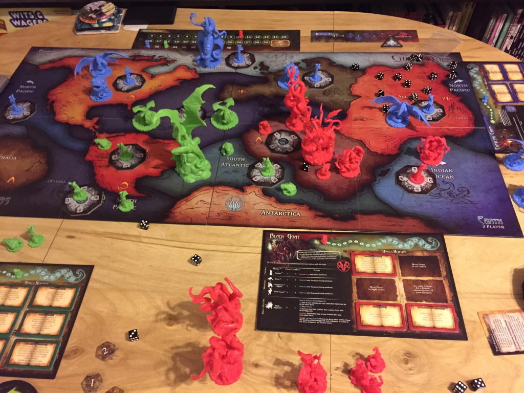 The Game: It’s all about area control, giant monsters, and expendable cultists. This game for 2+ players is a mix of area control and planning. You play as a faction of Lovecraftian gods and monsters who’re about to bring about the end of humanity. You open gates, summon monsters, despoil regions, and fight across a map of Earth. Whoever can bring about the most doom wins the wars. The basic rules are simple, centering the depth and complexity on the various factions that you can play. I love it.