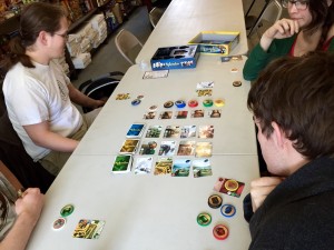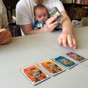 We wanted to start with something simple yet fun, a game that we could pick up and play throughout the day whenever games ended at different times, and there were a handful of people waiting around for the next “big” game to start. These kind of games are ideal for events like TableTop Day, playable in less than a half hour and easy to jump in at any time. Love Letter, Pairs, Get Bit, Sushi Go are all perfect examples of these quick games that you can play in between longer games (or while you’re in the middle of eating or holding a baby).