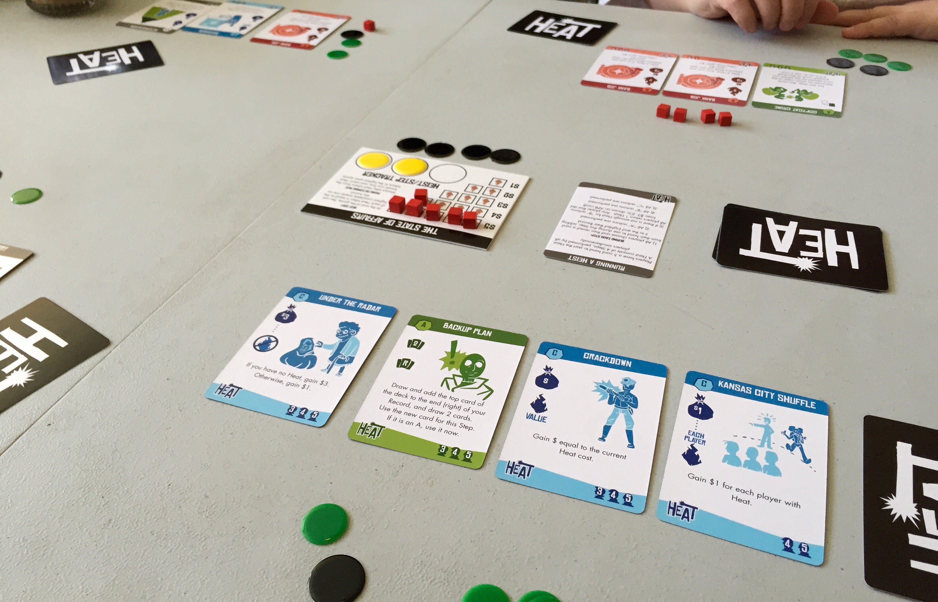 Splendor is one of my favorite games, an ever-shifting puzzle that you are trying to solve before the other players beat you to it. I discussed this game from Marc André in a previous post, and I’ve probably played it more than any other board game so far this year (even if I rarely win). Heat is a quick game of risk/reward from Dave Chalker, where you plan a trio of heists. I included Heat in my recap of Kickstarter board games, and it’s a great game that teases your brain in a different way from Splendor. Instead of solving a puzzle, you’re trying to anticipate your opponents’ moves while managing your pilfered cash (good!) and the heat you’ve gathered by pilfering (bad!).