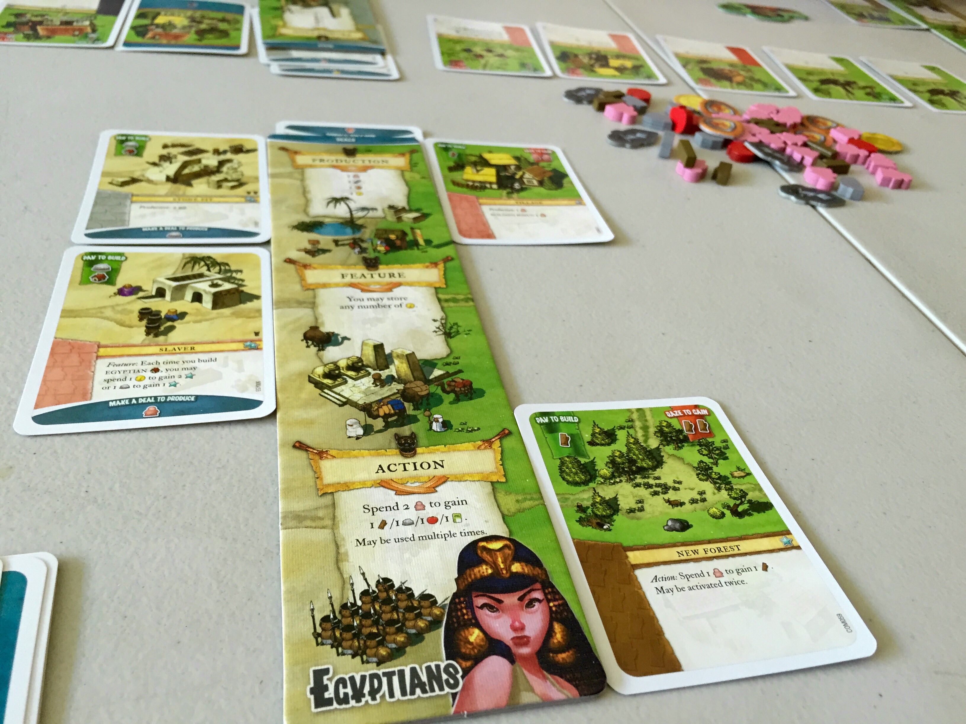 I settled on a recent game from Ignacy Trzewiczek, excited to have a chance for a four-player game of Imperial Settlers. We’d spent the night before TableTop Day tackling Trzewiczek’s intense co-operative game, Robinson Crusoe, so it was a nice change of pace to play against each other instead of against the game itself. Imperial Settlers is an economic game where players take the roles of historical(-ish) civilizations. Each civilization has five rounds to draw cards, build structures, make deals, and raze buildings in an attempt to generate the most victory points.