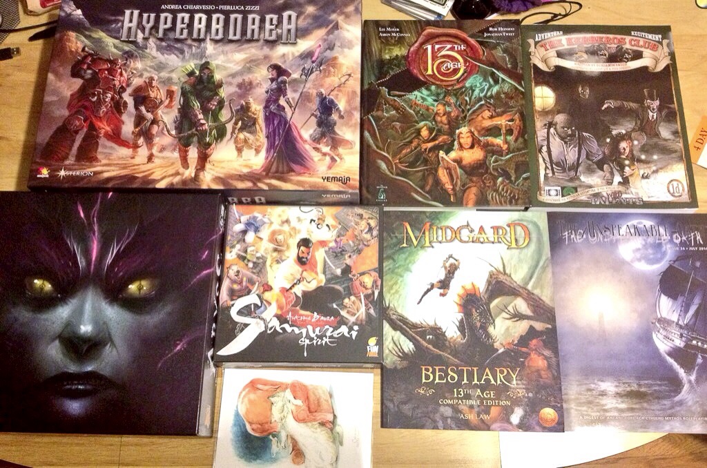 Interestingly, the picture above is smaller than expected, partially due to the role that Kickstarter is playing in the tabletop gaming industry. I don’t have stuff from Cthulhu Wars or Golem Arcana because they’re arriving later as Kickstarter rewards. I don’t have new stuff from Asmadi Games because I already have the print & play versions as I wait for the published editions. I did stop by the Storium meetup, which is a game I learned of through Kickstarter. Two of the biggest winners at the ENnies, Monte Cook and Evil Hat, published their award-winning core books via Kickstarter.