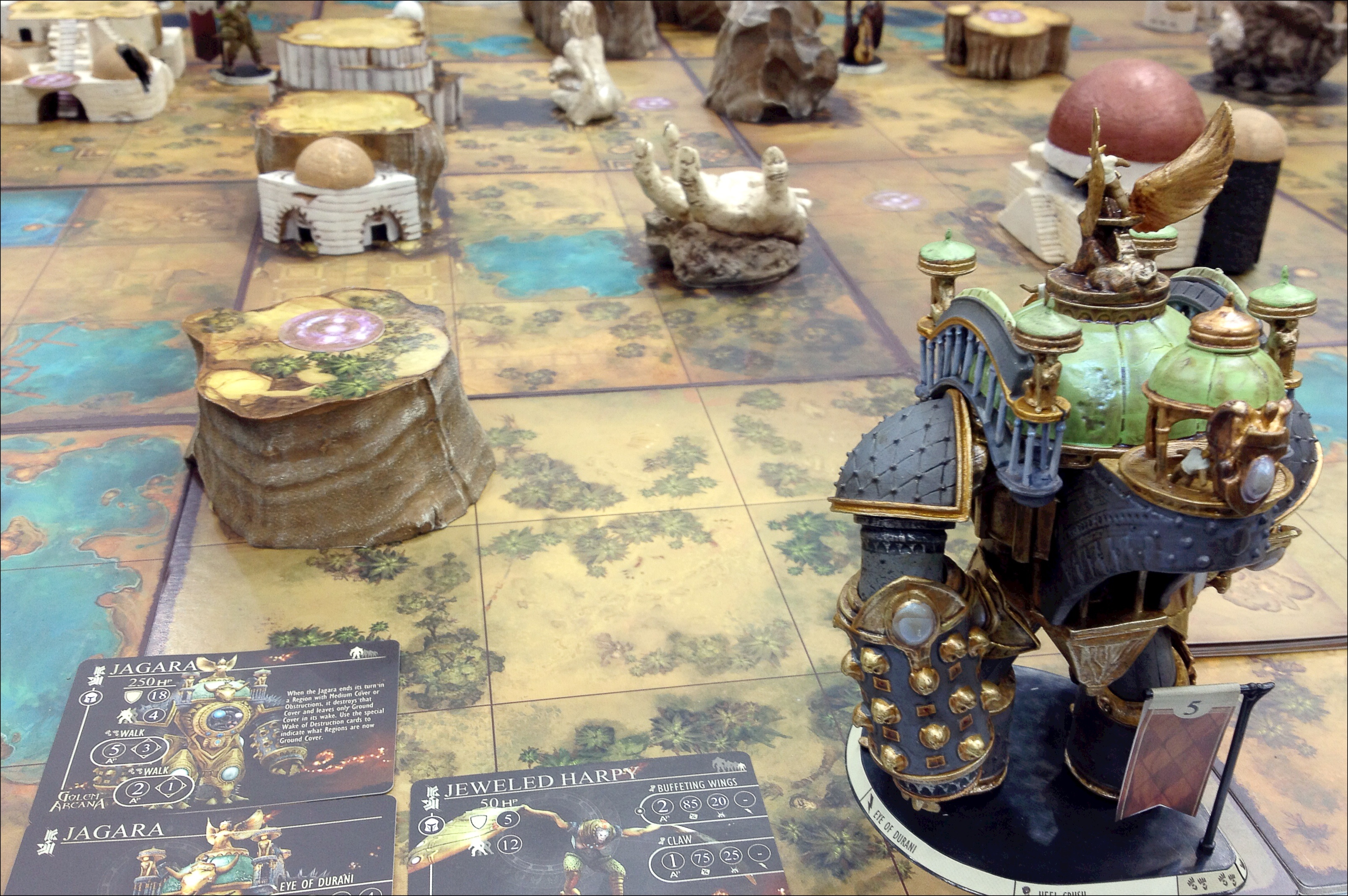There were so many shiny things, I didn’t even get a chance to buy or even try out most of them. I missed out on Imperial Settlers, Asmadi Games ran out of pre-release copies of Red before I could grab one, and I discovered Kingsport Festival (which wasn’t on my radar). I got to look at the miniatures for Cthulhu Wars (unspeakably gorgeous), learned to play Five Tribes and Hyperborea (the latter of which has become a new favorite), picked up Samurai Spirit and won an auction for the RPG books Midgard Bestiary and 13th Age. I also got to play Golem Arcana, a miniatures game that uses bluetooth technology and your smartphone or tablet to streamline the rules and stats.