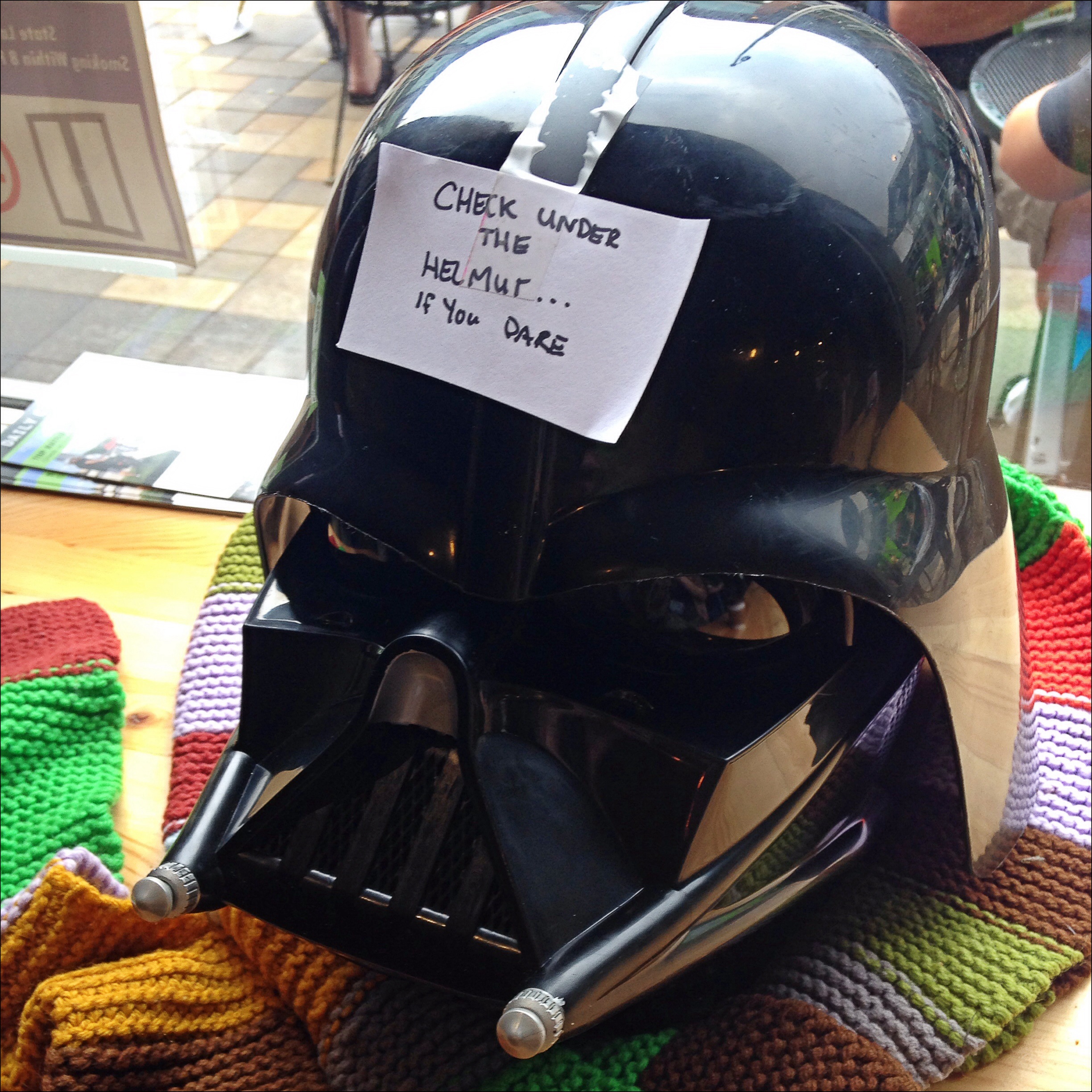 Another daily stop for me is Bee Coffee Roasters, which makes some damn fine coffee and really gets into the spirit ofbeing Gen Con’s neighbor. They put out dice for players to roll while they wait for their espresso, baristas dress up in costume, and the board offers special drinks around nerdy themes. Waiting patrons can also discover random geeky items lurking around the cafe, like a Darth Vader helmet resting on top of a Doctor Who scarf.