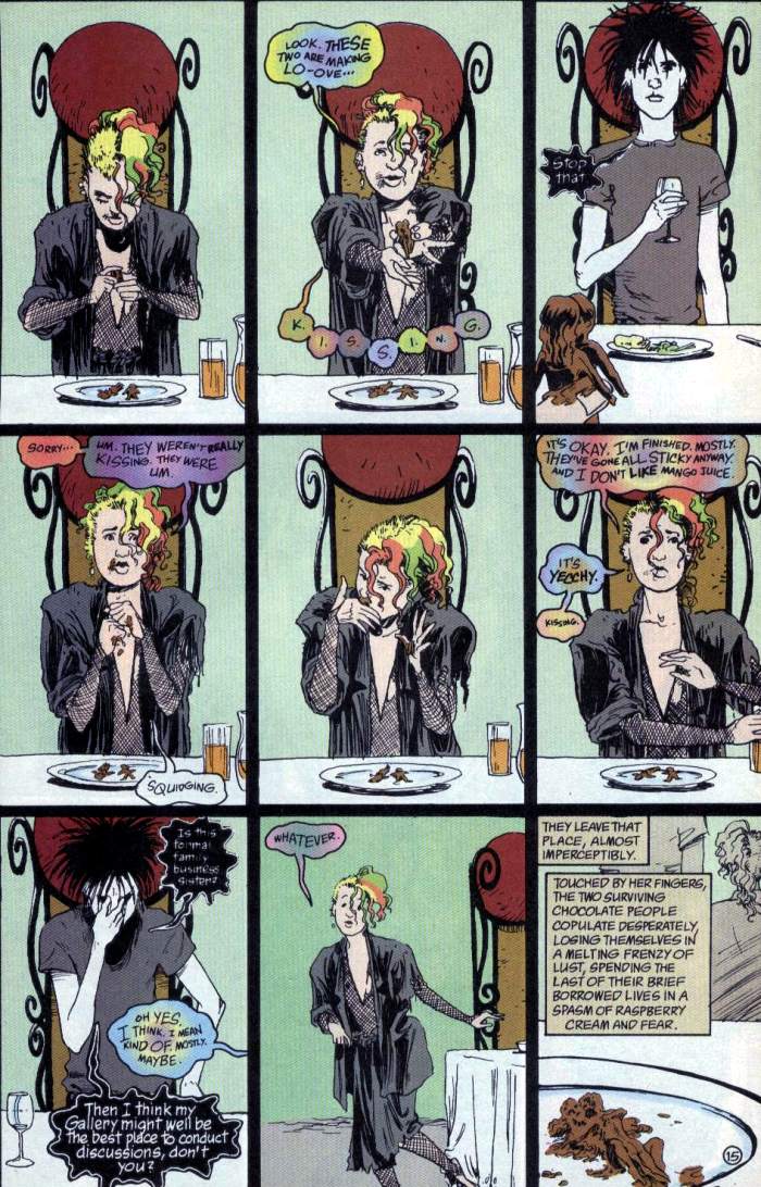 -J.: For me, the definitive version(s) of Delirium were drawn by Jill Thompson. This is a contradictory statement, since this particular Sandman character has no definitive version of herself. But whenever I imagine Delirium, she’s obviously drawn by Jill Thompson. There are many reasons that Sandman: Brief Lives is one of my favorite graphic novels, and Thompson’s art is high on that list. The character-defining relationship between Delirium and Barnabus the dog doesn’t work without Thompson’s pencils. The weight — personally and supernaturally — of Dream’s actions doesn’t come across as starkly without that last page before the epilogue.