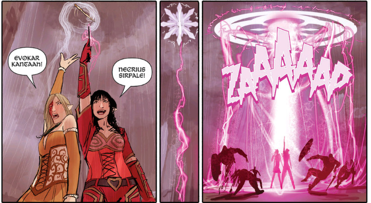 -J.: As a side note, I am totally writing up 13th Age rules for that ‘death shower’ spell that Tizzy and Hannah team up to cast. That’s why I love Rat Queens — it’s not just a cracking good story. It also makes you laugh, challenges your perceptions, and inspires you.