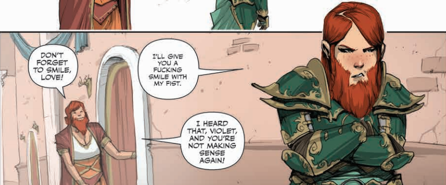 -J.: Despite the fact that the Queens aren’t getting run out of town, have found love & respect, and are earning coin, the group is far from harmonious or happy. Meanwhile, we start to learn a bit more about Gerrig, that shady merchant from volume 1.