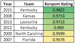 Kentucky is also loaded with talent. McDonald’s All-Americans status seems to be a pre-requisite for playing in Lexington. Unfortunately, due to their “platoon” style, no single Wildcat has played more than 65% of available minutes. For comparison, Player of the Year contenders Frank Kaminsky, Jahlil Okafor, and Delon Wright spend more than 75% of every game on the court.
