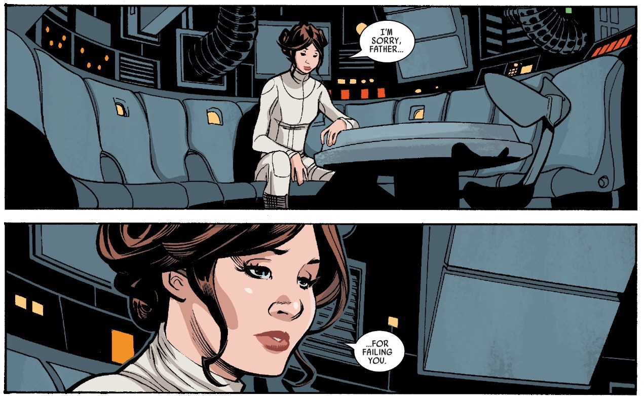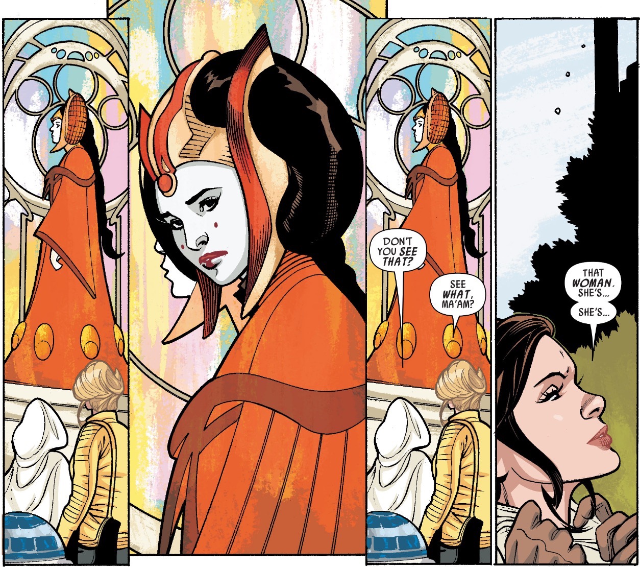 The second issue is split between flashbacks of Leia’s childhood and her mission on Naboo. Waid balances Leia’s mission to rescue a cloister of musicians with the lessons on governance and politics she learned as a child. He shows us how Leia’s brashness was a childhood trait that carries her forward in the present. Bail Organa tried to temper that brashness. He was a kind and gentle father. And, importantly, we see Leia encounter a frieze of Queen Amidala on Naboo with perhaps some hints of Leia’s Force sensitivity. Notice how Amidala is beautiful and sad in the frame below, how Leia describes the feelings and images she has of her real mother in Return of the Jedi. Interesting. The mission isn’t without its hitches but Leia and Evaan pull it off in the end, spiriting away the musicians from their cloister aboard a shiny, new starship.