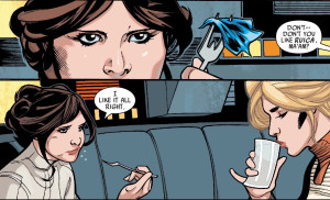 In the end of issue four, the diplomatic mission to the Alderaanian commune is a failure – one of the envoys insults the hosts with her bigoted disgust at their half-breed heritage – and Leia arranges to give herself up for the traitor’s sister. All seems lost.