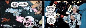 Our fifth and final issue is a doozy. Leia, ever the devious schemer and consummate planner, arranged with Nien Nunb to have herself rescued. She then flees toward the Alderaanian commune, expecting a powerful military to shield her refugees. Upon arrival she finds her plan in tatters and prepares to make a last stand against Imperial forces chasing her. Evan finally opens up to the princess as a friend and confidant rather than servant. As Leia broadcasts her final missive to the gathered refugee ships, Artoo secretly beams the message to the leaders of Espirion. Leia’s words reiterate the core of Alderaanian culture, a culture of understanding and creativity. Her words rallied the commune of Espirion to the defense of their brothers and sisters. The Espirion fleet destroyed the Imperial Star Destroyer and saved the Alderaanian people. In the denouement of this last issue Leia abdicates the throne and nominates Evaan for the position of queen before she returns to the Rebel fleet.