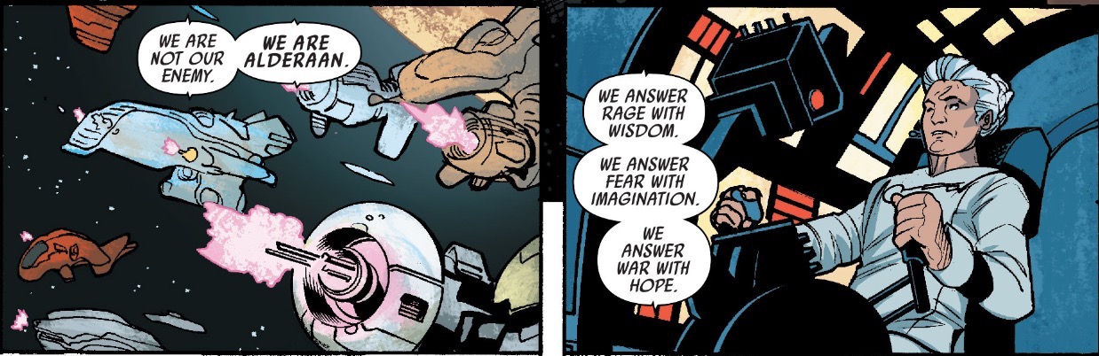 We are not our enemy. We are Alderaan. We answer rage with wisdom. We answer fear with imagination. We answer war with hope.