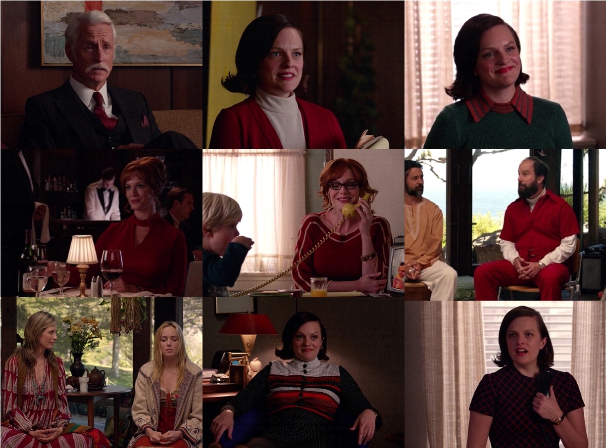 The logo ingrained in our minds of stark black and white with the red text. Red hasn’t been a color we’ve seen much of in the run of Mad Men. It wasn’t that popular of a color, besides lipstick and nail polish, in men’s and women’s fashion of the 1960s. But in true Janie Bryant fashion, the finale is filled with the colors of Mad Men. Nearly every scene has characters clothed in red, white, and black. And nearly every character gets their chance to shine in Mad Men hues. It’s a nice ending to an amazing show and the amazing thematically charged costumes as well.