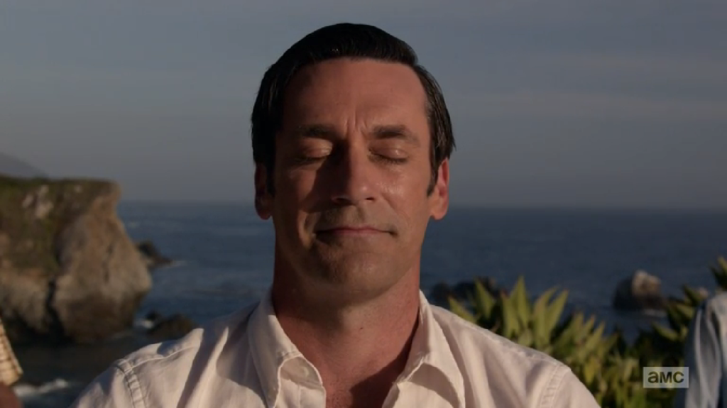 First, I liked the understated shot that the episode closed on. Don’s face, earnestly engaging in meditative yoga, is mostly blank until a bell rings and a satisfied smile spreads across his face. The close-up holds for a few seconds and then we cut to the Coca-Cola ad that makes everything before it a beguiling mix of hope, cynicism, and honesty.