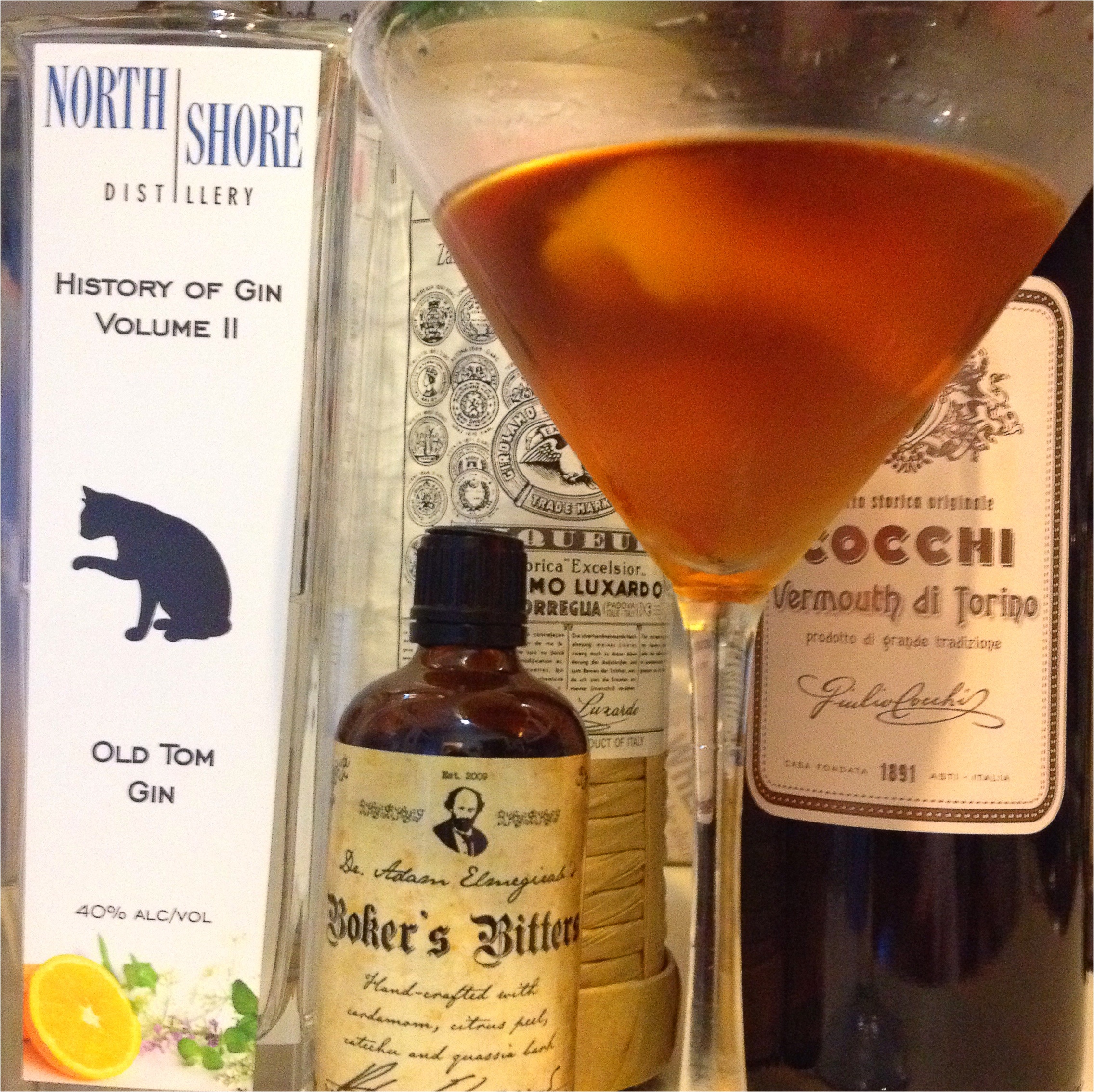 This is luxurious cocktail whose thick taste lingers on the tongue. It is the opposite of a dry cocktail — Old Tom is the sweeter pappy of London dry gin, Italian vermouth is sweeter than its dry French cousin, and it adds a dash of liqueur. The Boker’s bitters transform the cocktail from simply amazing into something utterly epic. You could use some combination of Angostura, orange, and/or cardamom bitters, and the drink will not disappoint; using Boker’s will make it absolutely sing.